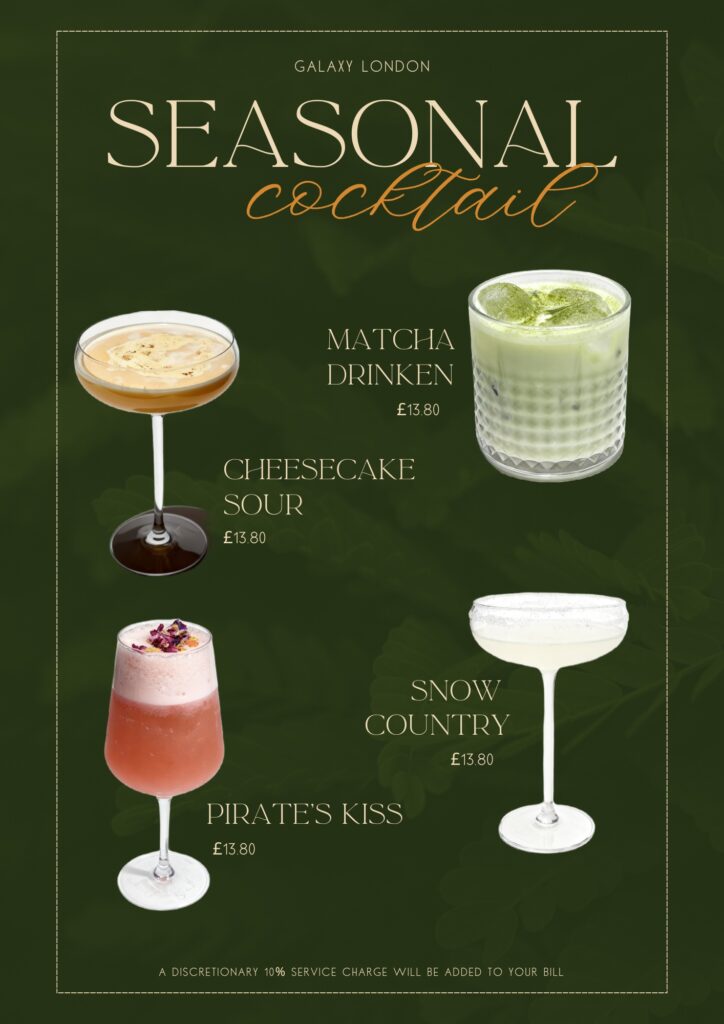 Seasonal Signature Cocktails Are Here! Experience the taste of the season with our limited-edition cocktails — crafted to match the vibe of now. These exclusive drinks are already a hit among our guests, so don’t miss out! Come and sip what everyone’s talking about at Galaxy London.
